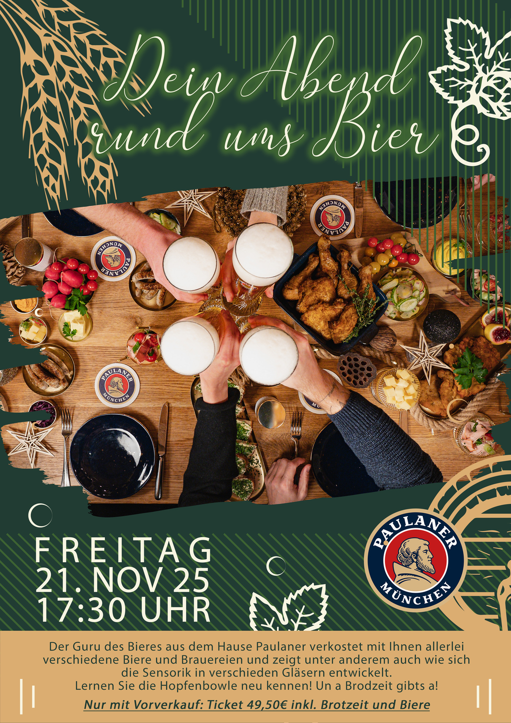 Genießen Sie zu unseren hausgemachten Speisen original Paulaner Bierspezialiäten vom Fass, regionale und internationale Weine unserer Partner-Winzer und hochklassige Aperitifs & Digestifs.